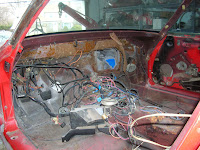 I couldn't stop myself. Once I started pulling the interior out, I figured the more stuff out of the way, the easier to work on things. I pulled out the brake and clutch pedal and the rest of the wiring harness after I took this pic.